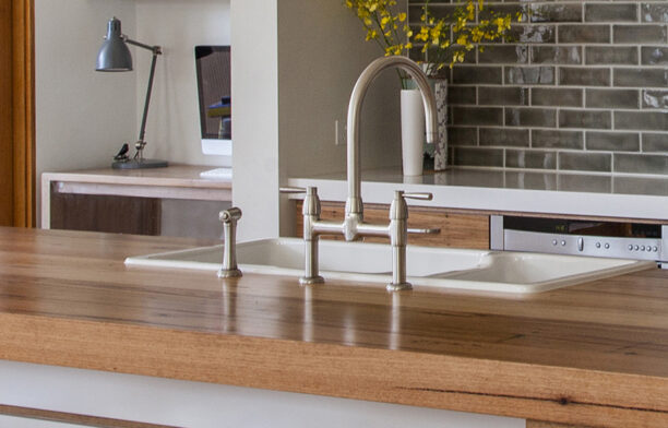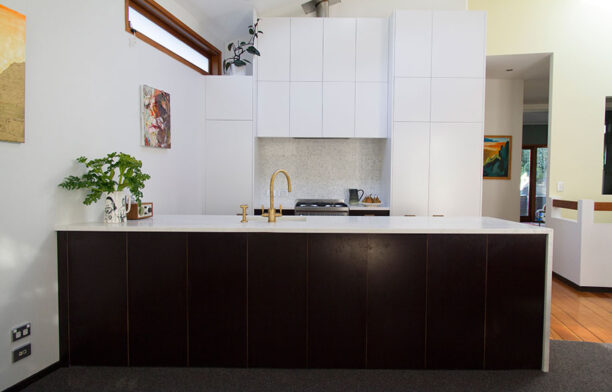 Showcasing a collection of English Tapware faucets and drawers, this fit out for a kitchen renovation reflects the homeowners’ passion for collecting art and beautiful craft objects.