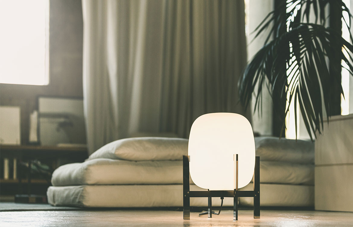 This enchanting, handcrafted lamp has been shaped using traditional steam bending techniques and is delicately polished and sturdily put together. It consists of a subtle cherry wood structure that holds an opal-shaped glass shade. Cesta is an excellent object and lamp, perfect for placing on a tabletop or resting on the floor, and the light can be dimmed according to preference.