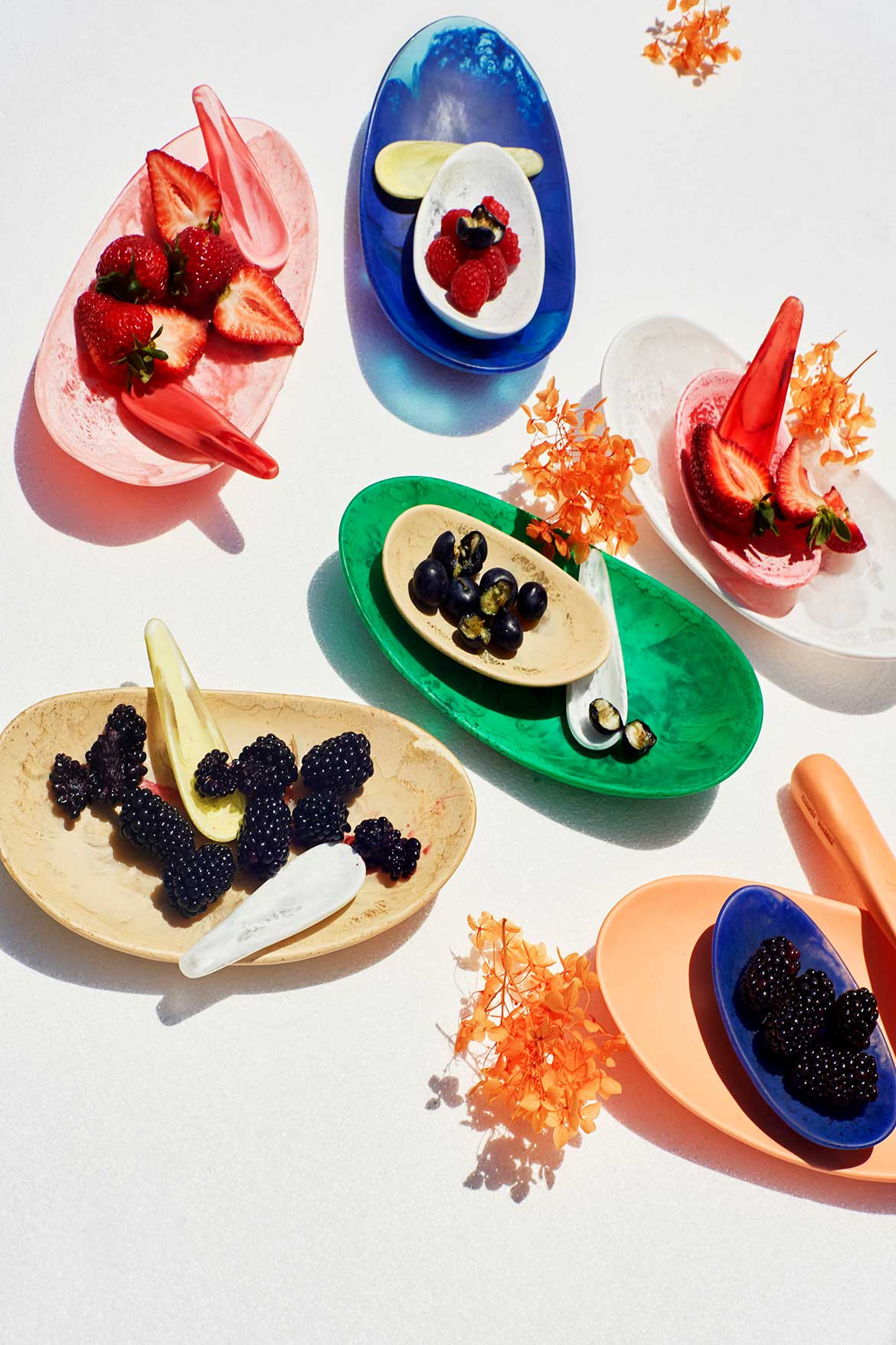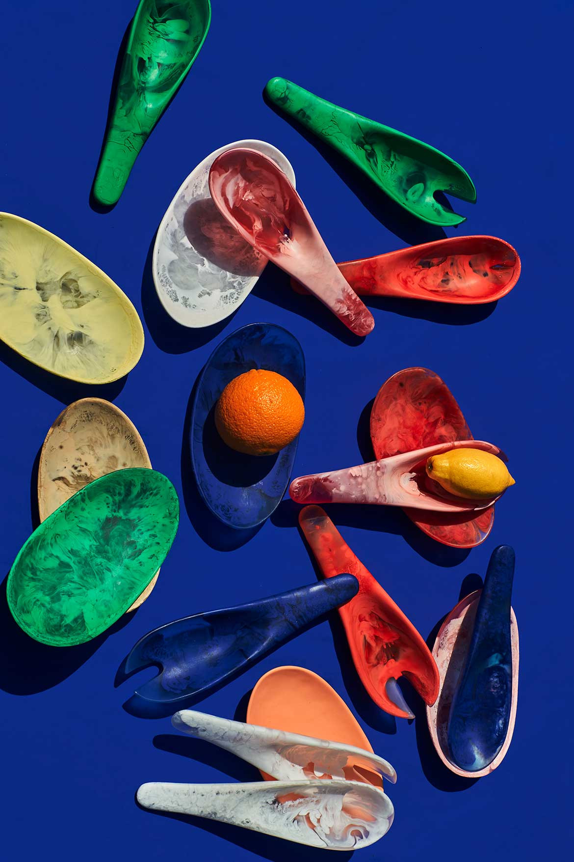 Lush, saturated colours such as Lemon, Leaf, Sandalwood, Cobalt and Peach are married with the classic Dinosaur Designs flourishes of Guava, Melon Swirl and Snow White Swirl. The resulting colour profile makes a beautiful, striking statement that serves the physical designs elegantly.