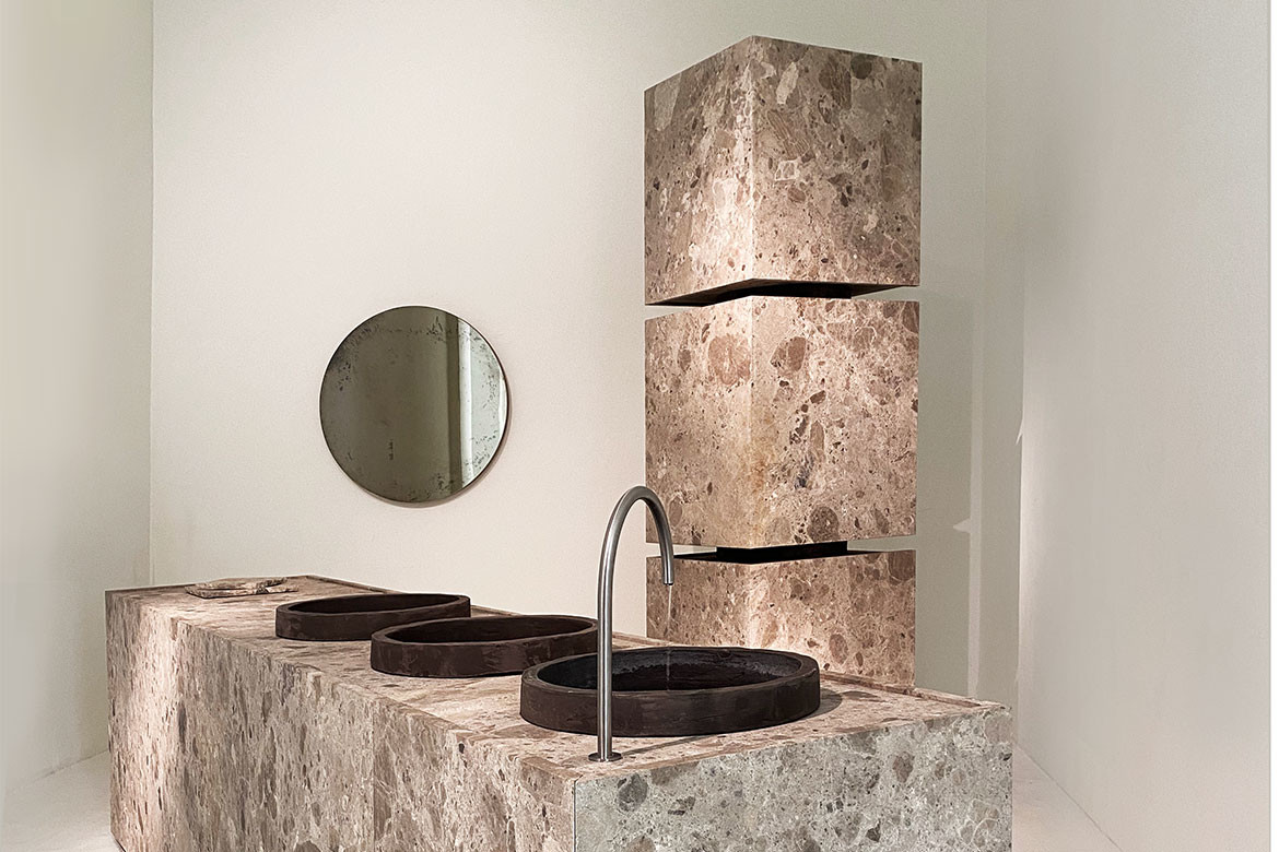 In the other monolithic shape in the kitchen, Timi references the thermopoliums of ancient Rome. These early equivalents of today’s streetfood stalls featured large benches inset with huge earthenware jars to store nuts and dried foods – some beautifully preserved examples were uncovered in Pompeii in 2021. Timi reinterprets these as large terracotta basins set into the stonetop.